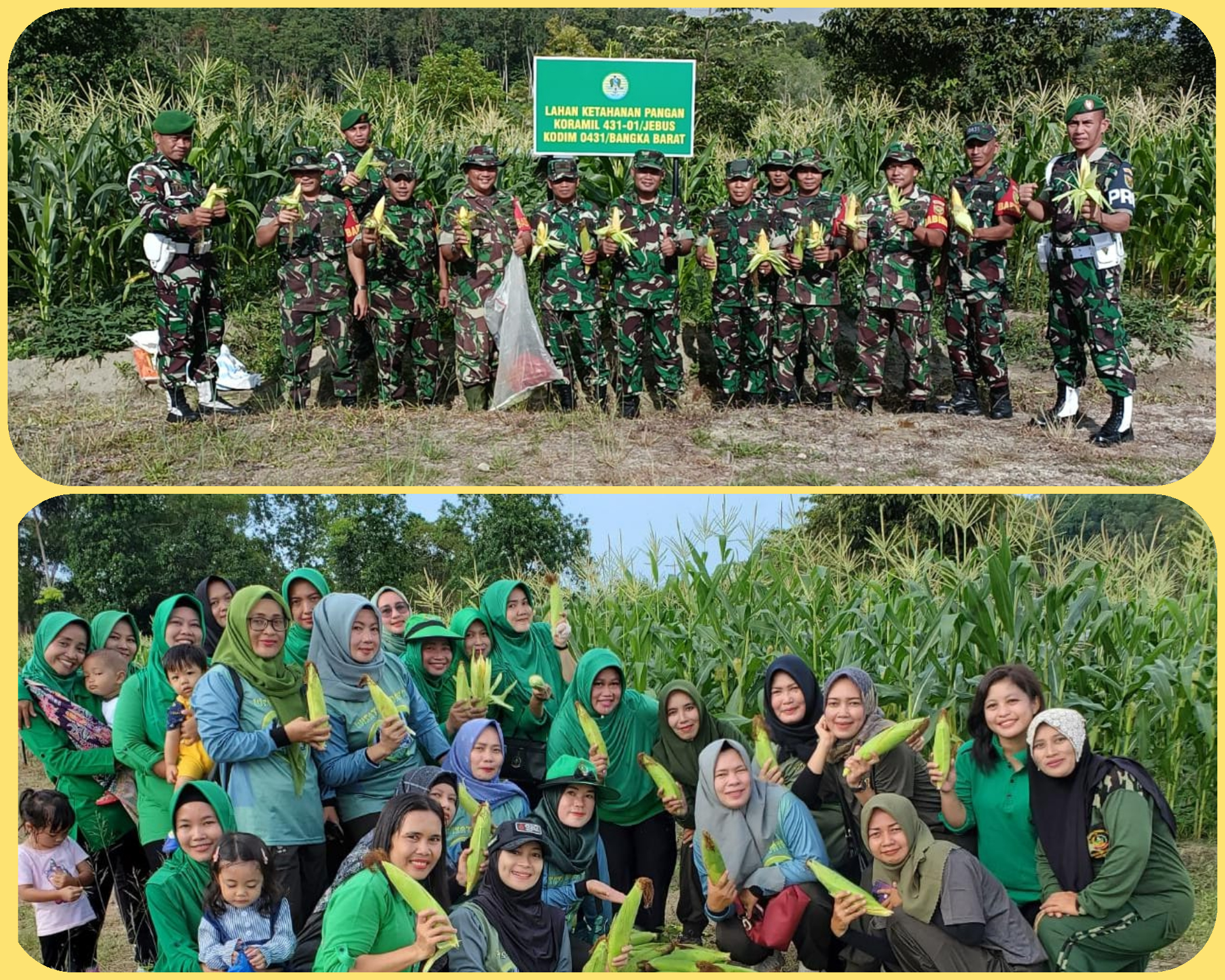 Dandim 0431/Babar, Letkol Inf Deri Indrawan dan Ibu Ketua Persit KCK Cab. LV Dim 0431/Babar Ny Dyja Deri Indrawan melaksanakan kegiatan panen raya Jagung Hanpangan Kodim 0431/Babar. Selasa, (11/04/2022)