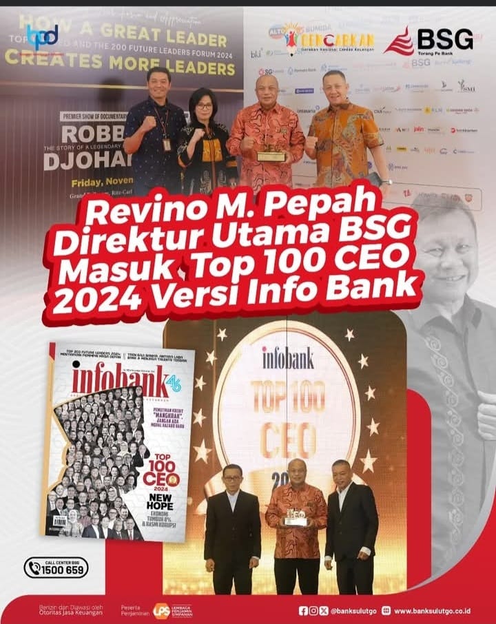 Pujian atas kinerja Revino M. Pepah sebagai Direktur Utama Bank SulutGo sudah memberikan bukti, nyatanya beliau bisa masuk Top 100 CEO TA 2024 dan di akui sebagai salasatu pemimpin Bank yang paling berpengaruh di Sulawesi Utara, ucap Mogonta.