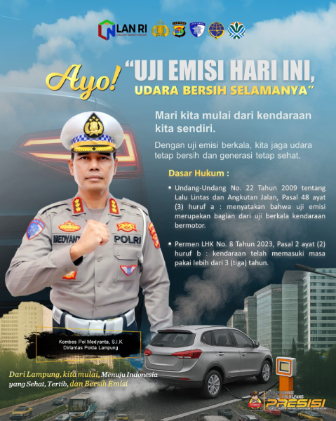 Dalam poster resmi yang dirilis Ditlantas Polda Lampung, Kombes Pol Medyanta menegaskan bahwa kendaraan bermotor merupakan salah satu kontributor utama pencemaran udara di wilayah perkotaan. Oleh karena itu, uji emisi secara berkala menjadi langkah nyata dalam menciptakan udara bersih dan menjaga kesehatan generasi masa depan.