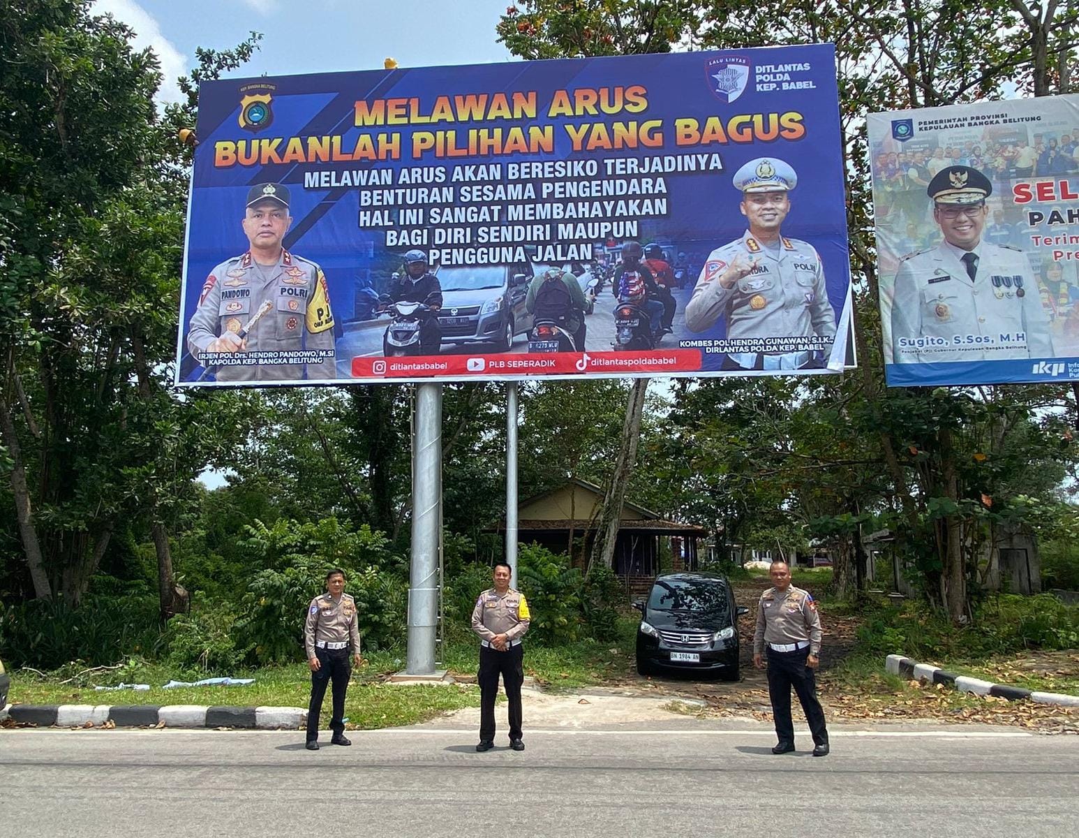 Sementara itu, spanduk himbauan yang dipasang oleh Direktorat Lalu Lintas Polda Babel ini berisi pesan tentang bahayanya berkendara melawan arus.