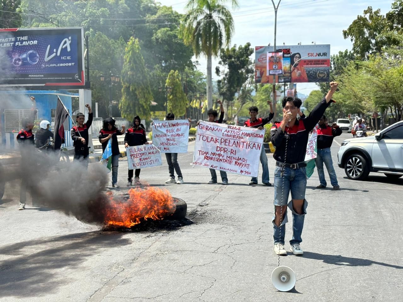 Dalam aksinya para mahasiswa pengunjuk rasa membakar ban mobil bekas dan membentangkan spanduk yang bertuliskan grand isu “TOLAK PELANTIKAN DPR-RI” dan petaka bertuliskan Tolak RUU dan UU yang kontroversial dan mendesak untuk mengesahkan RUU yang krusial, salah satunya adalah RUU Perampasan Aset dan RUU Masyarakat Hukum adat.