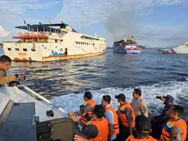 Manado, Adhyaksanews. -- -- - Kapolda Sulawesi Utara (Sulut) Irjen Pol Roycke Harry Langie didampingi Wakapolda Brigjen Pol Awi Setiyono, memimpin langsung upaya evakuasi para penumpang KM Barcelona V A, yang terbakar pada Minggu, 20 Juli 2025 siang.