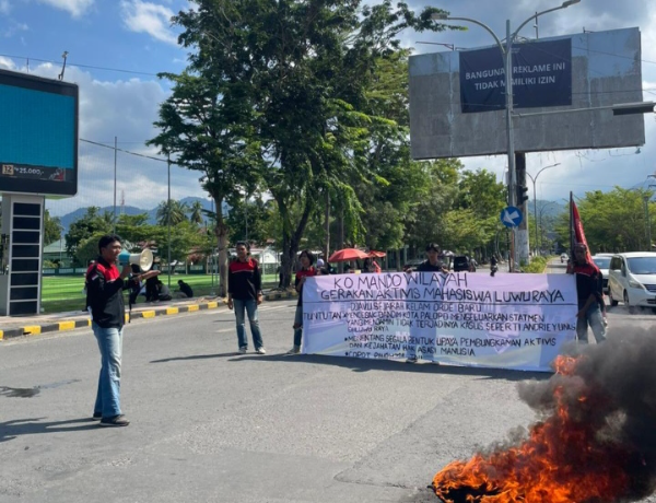 Dalam aksi tersebut, massa aksi mahasiswa bergantian berorasi dan membakar ban bekas sekaligus membentangkan spanduk putih bertuliskan “Mendesak Dandim Kota Palopo untuk memberikan statement yang menjamin tidak terjadinya kasus seperti andrie yunus di wilayah Luwu Raya.
