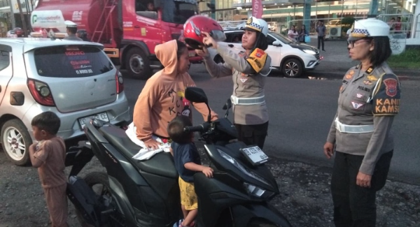 Mengetahui kondisi itu, AKP Dwi Dea Angraini mengambil langkah simpatik. Alih-alih sekadar menindak, ia justru mengambil satu helm dan langsung mengenakannya kepada sang ibu. Dengan nada lembut, ia kemudian meminta ibu tersebut segera melanjutkan perjalanan agar anaknya dapat segera mendapatkan penanganan.