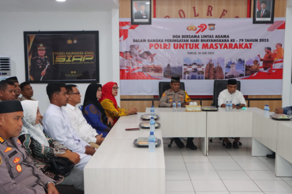 Adhyaksanews. -- -- *HUMAS POLRES HALUT* -Menjelang Peringatan Hari Bhayangkara ke-79 Tahun 2025, Polres Halmahera Utara menggelar kegiatan Doa Bersama lintas agama dengan mengusung tema “POLRI UNTUK MASYARAKAT," Kegiatan ini berlangsung khidmat di Ruang Vicon Mapolres Halmahera Utara, Maluku Utara, Rabu (18/6/2025)