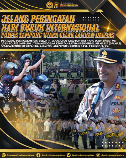 Adhyaksanews. -- -- Lampung Utara - Menjelang peringatan Hari Buruh Internasional atau May Day yang jatuh pada 1 Mei 2025, Polres Lampung Utara menggelar kegiatan latihan pengendalian massa (Dalmas) sebagai bentuk kesiapan dalam menghadapi potensi unjuk rasa, Rabu (30/4/25).