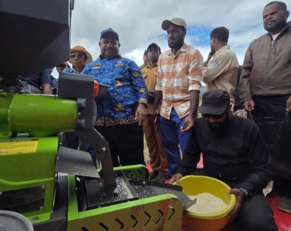 Wamena, Adhyaksanews. -- --Ketua Kamar Dagang dan Industri Indonesia (Kadin) Papua Pegunungan, Andru Bahabol, bersama Wakil Gubernur Papua Pegunungan, Dr. Ones Pahabol, SE., MM, melakukan kunjungan kerja ke area persawahan Wita-Waya, Kabupaten Jayawijaya, sekaligus mengikuti panen raya padi, Kamis (15/11). Dalam kegiatan tersebut, keduanya turut melakukan perontokan padi menggunakan mesin mini hingga proses penggilingan langsung di lapangan.