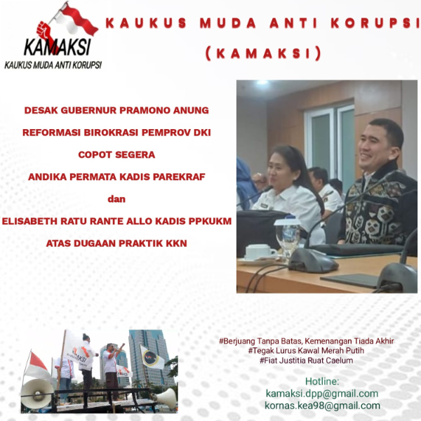 Adhyaksanews. -- -- Jakarta. Kaukus Muda Anti Korupsi (KAMAKSI) mendesak Gubernur DKI Jakarta Pramono Anung untuk segera melakukan reformasi birokrasi secara menyeluruh, terutama dengan mencopot Kepala Dinas Pariwisata dan Ekonomi Kreatif (Parekraf) Andhika Permata dan Kepala Dinas Perindustrian, Perdagangan, Koperasi, Usaha Kecil dan Menengah (PPKUKM) Elisabeth Ratu Rante Allo. Keduanya diduga terlibat dalam praktik Korupsi, Kolusi, dan Nepotisme (KKN) di lingkungan Pemprov DKI.