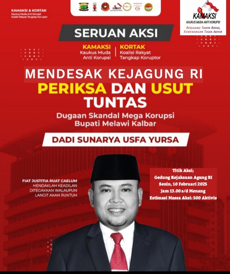 Adhyaksanews, Jakarta – Kaukus Muda Anti Korupsi (KAMAKSI) bersama Koalisi Rakyat Tangkap Koruptor (KORTAK) akan menggelar aksi damai di Gedung Kejaksaan Agung Republik Indonesia pada Senin, 10 Februari 2025. Aksi ini bertujuan untuk mendesak Kejaksaan Agung segera memeriksa dan mengusut tuntas dugaan skandal mega korupsi yang melibatkan Bupati Melawi, Dadi Sunarya Usfa Yursa. (Rabu,05/02/2025).