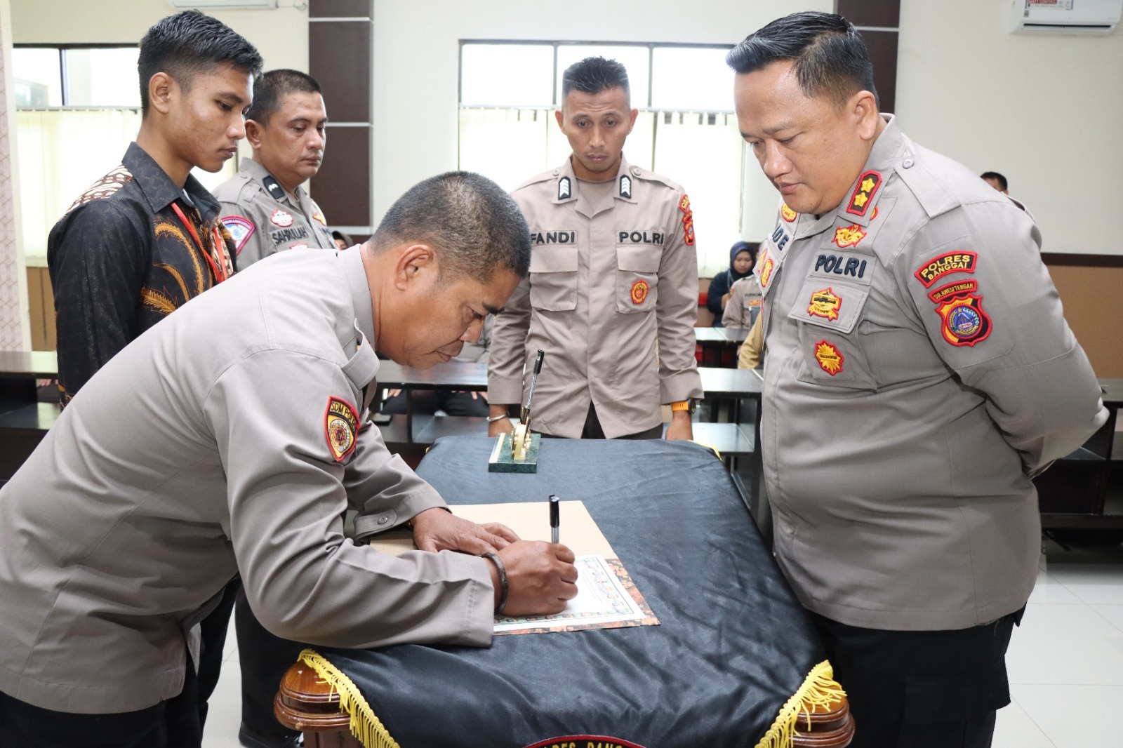 Kapolres Banggai AKBP Ade Nuramdani SH, SIK, MM, mengikuti Pakta Integritas Rim Akpol, Bintara dan Tamtama Polri TA. 2023 Polda Sulteng di Aula Rupatama, Mapolres Banggai, Selasa (18/4/2023).
