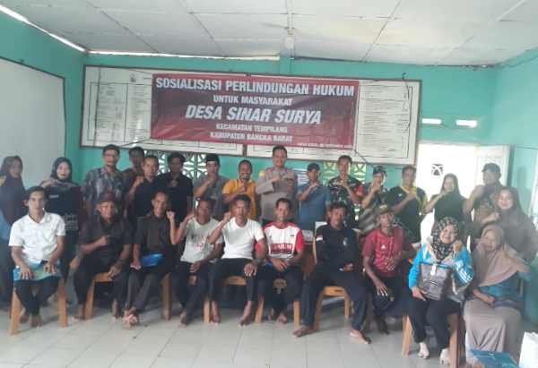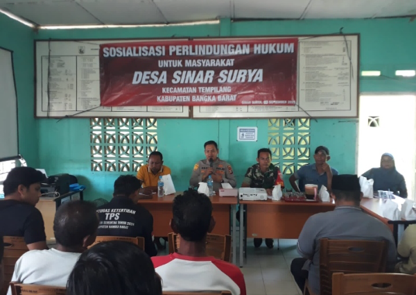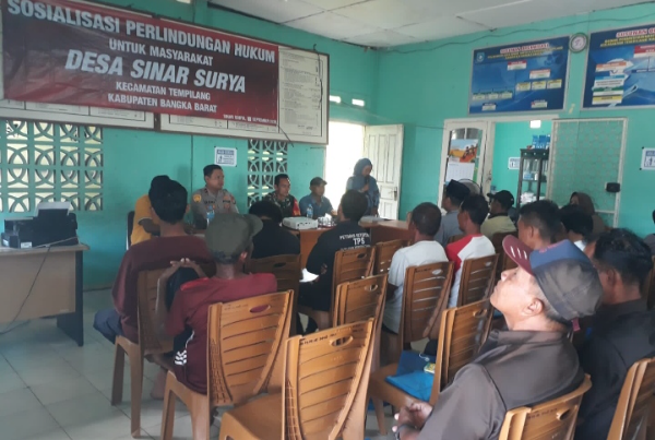 Kapolsek Tempilang Ipda Deni memimpin langsung kegiatan Sosialisasi Perlindungan Hukum untuk Masyarakat di Kantor Desa Sinar Surya, Kecamatan Tempilang, pada Kamis (18/09/2025).