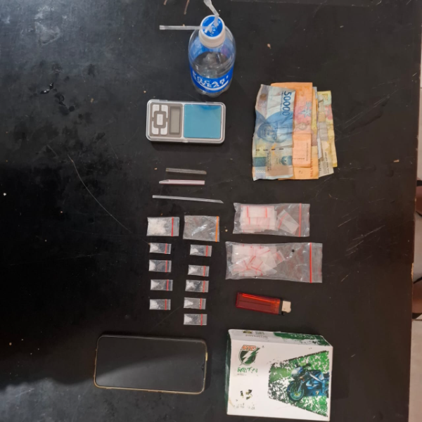 Selain narkoba, petugas juga mengamankan berbagai barang bukti lainnya yang menunjukkan aktivitas perdagangan narkoba. Barang-barang tersebut meliputi satu bungkus plastik sedang, satu buah bong terbuat dari botol plastik, satu buah timbangan elektronik, dua bal bungkus plastik kosong, satu buah korek api berwarna merah, satu buah kotak lampu sepeda motor, satu buah sekop terbuat dari plastik, satu unit handphone merek Vivo, dan uang tunai sebesar Rp 65.000 yang diduga hasil penjualan narkoba.
