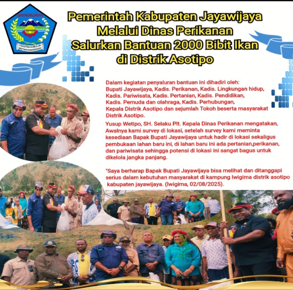 Wamena, Adhyaksanews. -- --Kelompok perikanan di Kabupaten Jayawijaya menyampaikan apresiasi mendalam kepada Pemerintah Kabupaten Jayawijaya atas penyaluran bantuan bibit ikan yang dilakukan pada Sabtu, 2 Agustus 2025. Bantuan tersebut disalurkan langsung oleh Pelaksana Tugas (Plt.) Kepala Dinas Perikanan Kabupaten Jayawijaya, Yusup Wetipo, S.H., di Distrik Assotipo, sebagai bagian dari program 100 hari kerja Bupati Atenius Murib, S.H., M.H.