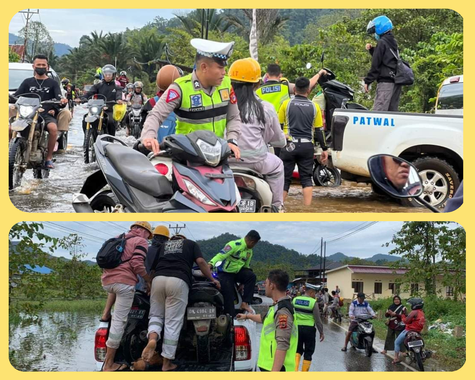 Terlihat kesigapan personel Satlantas juga saat mengevakuasi pengendara yang motornya yang harus mogok di tengah kepungan banjir karena berusaha menerobos banjir.