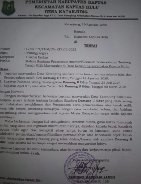 Akan tetapi sampai saat ini belum juga ada tindakan apapun dari pihak Kepolisian Sektor Kapuas hulu, sehingga Masyarakat Desa Katanjung yang merasa di rugikan sangat resah dan khawatir karena Saudara Damang U. Udur masih saja tetap beraktivitas, bahkan lahan milik Warga tersebut dibabat habis pohon getah karetnya yaitu Milik Saudara Rahman Idung Raba.