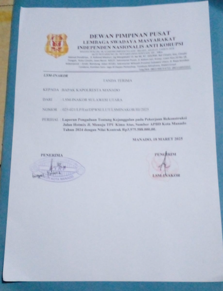 Adhyaksanews. -- -- Manado, Diduga rawan penyimpangan dan merugikan keuangan negara, Lembaga Swadaya Masyarakat (LSM) Independen Nasionalis Anti Korupsi (INAKOR) Sulawesi Utara melaporkan proyek Pekerjaan Rekonstruksi Jalan Hotmix Jl, menuju TPU Kima ke Polres Manado.