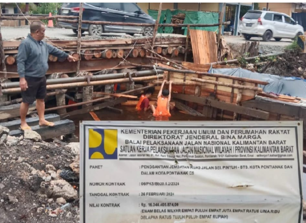 "Pekerjaan tersebut ialah penggantian jembatan jalan ruas jalan sungai Pinyuh – Batas, Kota Pontianak dan dalam Kota Pontianak . Yang terletak di dua titik yaitu kecamatan Segedong dan di kecamatan Siantan dengan nilai kontrak Rp. 16.044.405.874,00 yang menggunakan anggaran APBN tahun 2024" Bebernya Rabu (12/03/25).