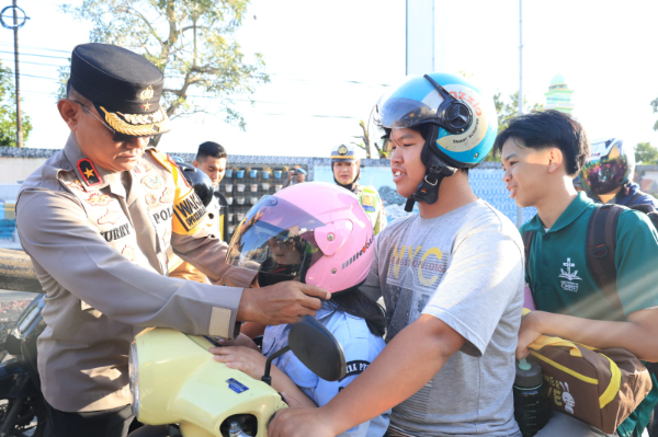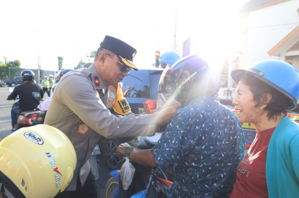"Fokus kita bersamaan dengan berlangsungnya Operasi Keselamatan, kebetulan ada Pak Wakapolda ikut mengedukasi masyarakat terutama pengendara motor sekaligus membagi dan mengggantikan helm yang sudah rusak dan mengingatkan jangan lupa di klik,"kata Kombes Pol Pringadhi usai bagi-bagi helm gratis.