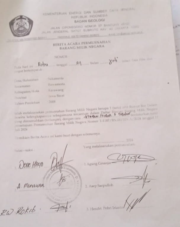 Perlu diketahui bahwa Surat Berita Acara Pemusnahan Barang Milik Negara pada 24 Juli 2024 yang diterbitkan Kementerian ESDM cq Badan Geologi ini ditandatangani saksi yaitu Dede Harto (Sekdes Sukamerta), A. Munawar (Perangkat Desa Sukamerta) dan RW Rokib. Sementara itu yang tanda tangan dari pihak Badan Geologi yaitu Agung Ginanjar, Asep Saepuloh dan Hendri Pebri Irianto.