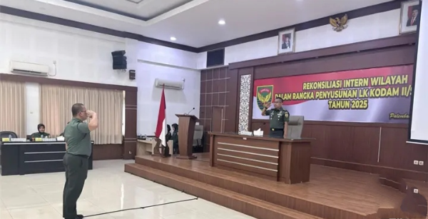 Palembang, Adhyaksanews. -- --Kodam II/Sriwijaya menyelenggarakan kegiatan Rekonsiliasi Intern Wilayah dalam rangka penyusunan Laporan Keuangan (LK) Tahun Anggaran 2025, bertempat di Gedung Nasution, Palembang, Kamis (15/01/2026). Kegiatan ini dipimpin langsung oleh Asrendam II/Sriwijaya, Kolonel Inf Mustamin, dan dihadiri oleh para pejabat logistik serta keuangan dari berbagai satuan jajaran Kodam II/Sriwijaya, baik secara tatap muka maupun virtual.