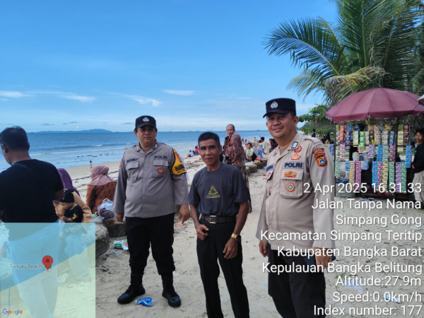 Adhyaksanews. -- -- Simpang gong. Menyambut libur lebaran, Polsek Simpang Teritip melakukan pengamanan dan patroli di Pantai Tungau, Desa Simpang Gong, Kecamatan Simpang Teritip, Kabupaten Bangka Barat. Kegiatan ini bertujuan untuk menciptakan situasi yang aman dan kondusif di lokasi wisata yang sering dikunjungi masyarakat selama liburan lebaran. 2 April 2025.