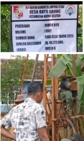 Pembangunan 2 Titik sumur bor ini adalah merupakan Solusi Atasi Krisis Air Bersih, selama ini bergantung pada pasokan air dari Perusahaan Air Minum (PAM). Namun, masalah kelangkaan air semakin menjadi-jadi seiring waktu. Banyak warga mengeluhkan aliran air PAM yang tidak lancar, bahkan beberapa harus rela begadang di malam hari untuk mendapatkan air. Melihat kondisi ini, warga dusun 6 desa ratu abung mengusulkan dalam acara Musyawarah Desa ( Musdes) Penyusunan RKPDes agar membangun sumur bor yang di laksanakan di dusun 6.Rabu (02/07/2025).