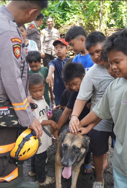 Anak-anak tampak antusias dan gembira saat berinteraksi langsung dengan anjing pelacak K-9 yang memiliki spesifikasi SAR. Kehadiran satwa K-9 ini tidak hanya menjadi sarana hiburan, tetapi juga media terapi psikologis yang efektif untuk membantu mengurangi trauma, rasa takut, serta tekanan emosional yang dialami anak-anak pascabencana.