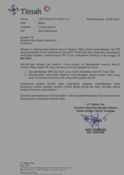 "Terhitung tanggal tertulis mulai Hari ini (Tanggal 17 Mei 2025) kegiatan penambangan PIP di Laut Sukadamai dihentikan, dan kepada direktur CV agar mengembalikan SPK dan Silo resmi yang dikeluarkan oleh PT Timah Tbk" Jelas Sigit Prabowo