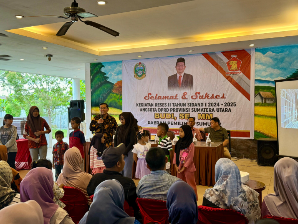 Adhyaksanews. Serdang Bedagai, 11 Maret 2025 – Anggota DPRD Provinsi Sumatera Utara dari Fraksi Gerindra, Budi SE MM, menggelar reses II masa persidangan I Tahun 2024-2025 di Theme Park & Resort, Kecamatan Pantai Cermin, Kabupaten Serdang Bedagai. Kegiatan ini dihadiri oleh ratusan masyarakat, termasuk perwakilan guru, wali murid, serta puluhan siswa SD dan SMP.