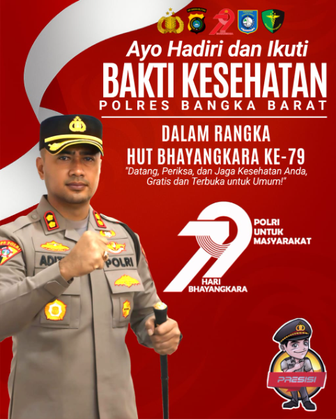 Adhyaksanews. -- -- Bangka Barat. Dalam rangka menyambut Hari Bhayangkara ke-79, Polres Bangka Barat menggelar kegiatan Bakti Kesehatan berupa pengobatan gratis untuk masyarakat umum. Kegiatan ini akan dilaksanakan pada Rabu, 4 Juni 2025 besok, bertempat di Terminal Lama Mentok, tepatnya di depan Masjid Jami Mentok, mulai pagi hari. 3 Juni 2025