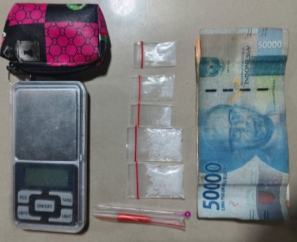Tersangka yang berhasil diamankan berinisial APT (18), dengan barang bukti berupa 5 plastik klip sabu, 2 pipet ujung runcing, 1 buah dompet, 1 unit timbangan elektrik, serta uang tunai sebesar Rp60.000,-.