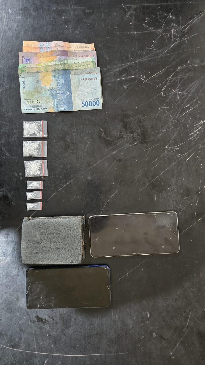 "Total barang bukti yang diamankan dalam operasi ini adalah tiga bungkus plastik klip transparan berukuran sedang dan tiga bungkus plastik klip transparan kecil berisi narkotika jenis sabu dengan total berat bruto 4,31 gram," jelas AKP Verry Purba. Selain itu, petugas juga menyita barang bukti lain berupa satu unit HP Android merk Samsung, satu unit HP Android merk Vivo, dan uang tunai sebesar Rp 200.000 yang diduga hasil penjualan narkoba.