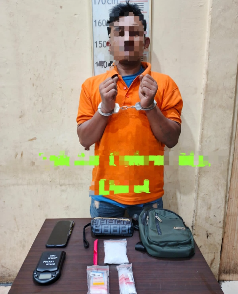 Selain itu turut diamankan 1 unit timbangan elektrik, 2 bal plastik klip bening kosong, 1 dompet warna batik, 1 unit handphone Oppo warna hitam, 1 sekop yang terbuat dari pipet plastik, serta 1 tas sandang samping warna hijau.
