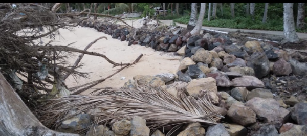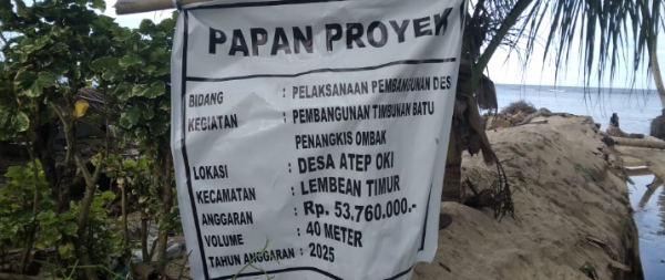 Proyek penimbunan batu penangkal ombak di Dusun 2 adalah tahap pertama, menelan anggaran Rp53.760.000 dengan panjang 40 meter.