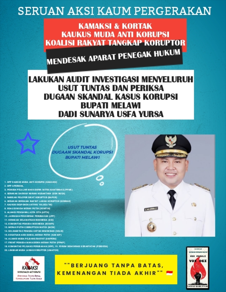 Adhyaksanews, Jakarta --Gerakan anti korupsi kembali menggema, KAMAKSI (Kaukus Muda Anti Korupsi) dan KORTAK (Koalisi Rakyat Tangkap Koruptor) bersama elemen masyarakat akan menggelar "Seruan Aksi Jilid III, untuk mendesak Aparat Penegak Hukum (*APH*) segera mengusut tuntas dugaan skandal mega korupsi yang diduga melibatkan Bupati Melawi, Dadi Sunarya Usfa Yursa.(selasa,11/02/2025)