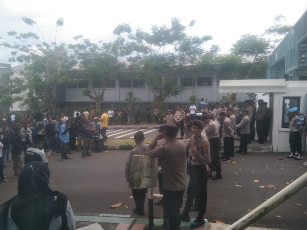 Aparat kepolisian bersama Satpol PP disiagakan untuk menjaga ketertiban dalam aksi. Suasana sempat memanas ketika massa mendesak untuk masuk ke halaman kantor, namun berhasil diredam aparat.