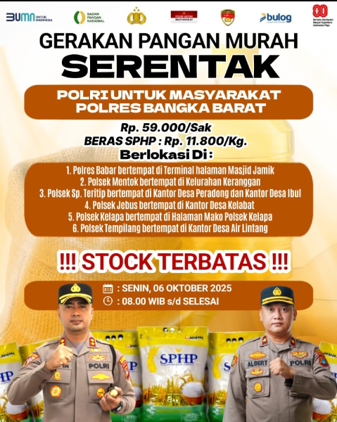 Dalam kegiatan ini, Polres Bangka Barat menyediakan beras SPHP dengan harga Rp11.800 per kilogram atau Rp59.000 per sak, dan dilaksanakan serentak di beberapa lokasi wilayah hukum Polres Bangka Barat.