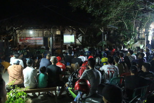 Layar proyektor terpampang di dinding warung, bangku plastik tersusun rapi, dan warga berjejer menanti momen bersejarah: laga Timnas Indonesia melawan China di Kualifikasi Piala Dunia 2026.