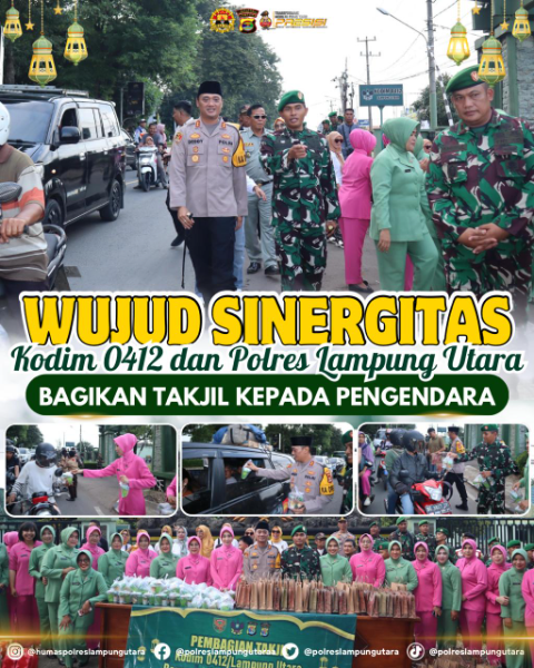 Semangat bersinergi dalam berbagi di bulan suci Ramadhan, Kodim 0412/LU bersama Polres Lampung Utara menggelar kegiatan pembagian takjil gratis bagi masyarakat dan pengguna jalan depan Makodim setempat, Kamis (27/3/25).